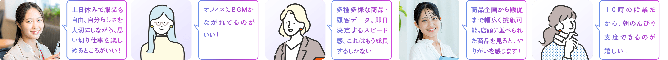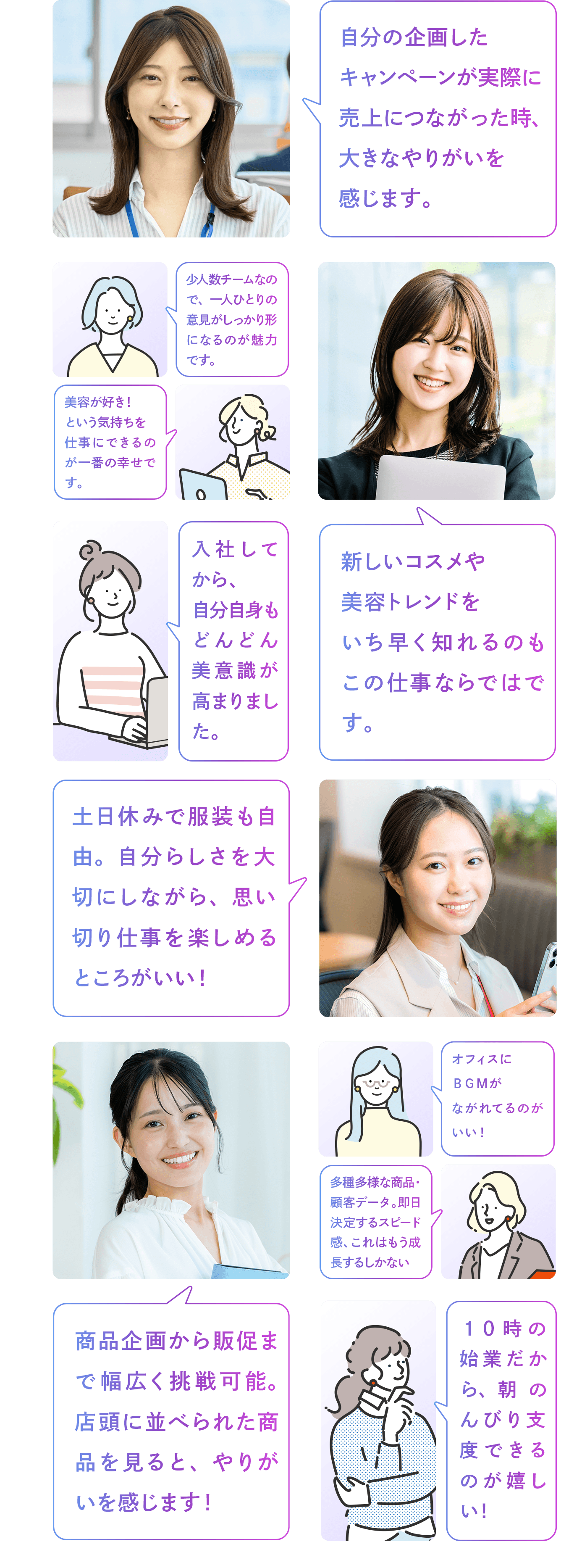 美容・健康・ライフスタイル分野の最前線で、あなたの“トレンドを感じ取る力”や“発想力”を活かせる環境です。SNSやマーケットの動きをいち早くキャッチし、新商品を企画して新しいムーブメントを発信。 あなたの感性やアイデアが、次の“バズ”を生み出すきっかけになるかもしれません。