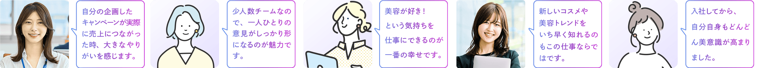 ECというフィールドは変化が早く、答えが一つではありません。だからこそ、自分の「好き」や「得意」を自由に発揮できる環境が大切です。当社では、美容・デザイン・マーケティング・ものづくり・コミュニケーション、それぞれの分野で個性を活かしながら成長できるチャンスがあります。